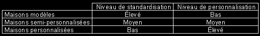 Tableau 1 : Les niveaux de standardisations et de personnalisation des différents types de maisons.